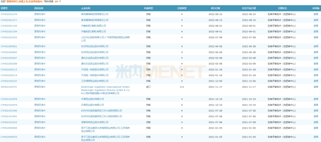 目前,恩格列凈片有6家企業(yè)擁有生產(chǎn)批文,四川科倫藥業(yè)、正大天晴藥業(yè)集團(tuán)、江蘇豪森藥業(yè)等5家國(guó)內(nèi)企業(yè)均以仿制4類獲批,視同過(guò)評(píng)。齊魯制藥(海南)、成都倍特藥業(yè)、樂(lè)普藥業(yè)等超過(guò)10家企業(yè)報(bào)產(chǎn)在審。
