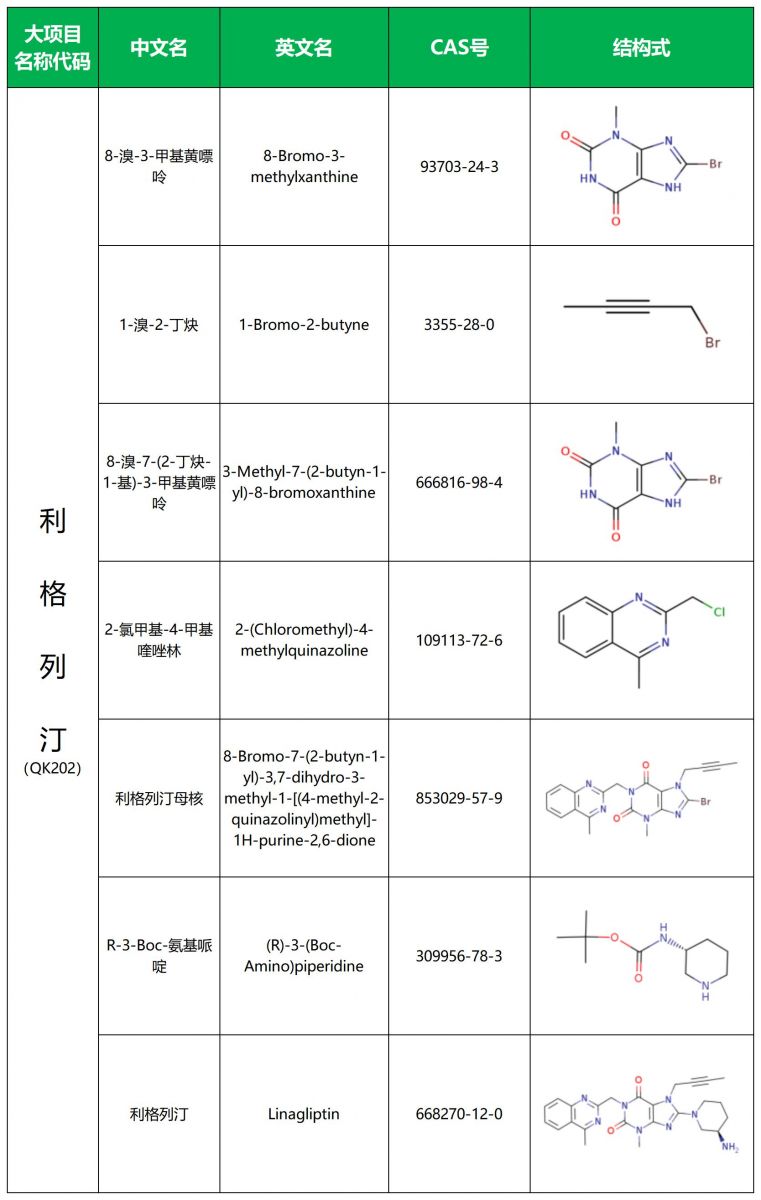 利格列汀母核、8-Bromo-7-(2-butyn-1-yl)-3,7-dihydro-3-methyl-1-[(4-methyl-2-quinazolinyl)methyl]-1H-purine-2,6-dione、853029-57-9;