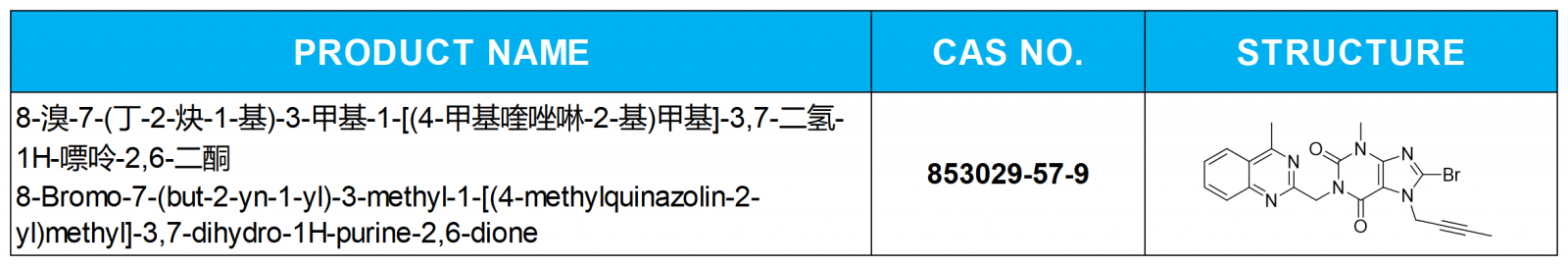 中文名稱: 8-溴-7-(丁-2-炔-1-基)-3-甲基-1-[(4-甲基喹唑啉-2-基)甲基]-3.7-二氫-1H-嘌呤-2.6-二酮